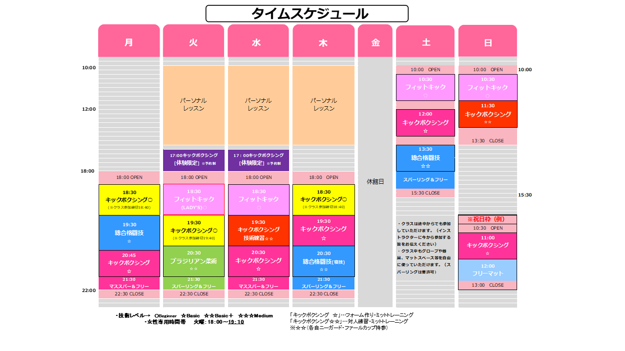 ・ジムオープン中でクラス以外の時間帯はマットスペース・道具(グローブ・ミット等)を自由に使っていただけます。(スパーリングは要許可)